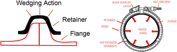 V-Band clamp’s method of operation is based on principle of inclined plan (Wedging action). When the closure bolt is tightened, this exerts radial force on the V-profile segments. The two halves of the flange are pressed axially together by means of the V-Petal wedging action (see diagram below). The radial force that is exerted is converted into considerably higher axial force.