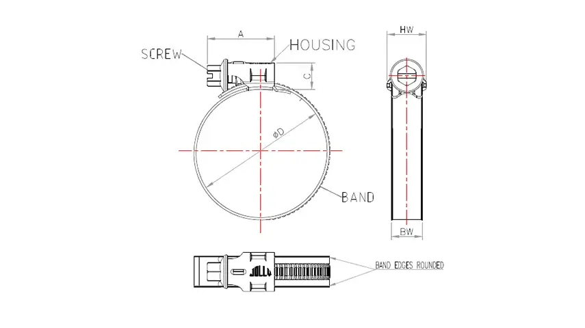 The clamp operates on the principle of worm gear action. The cleanly formed serrations on the band interact with the thread of the Hex Head Screw, enabling secure tightening or loosening while protecting soft hoses from damage.