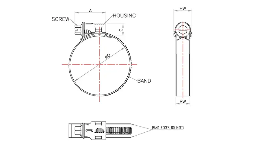 The Jolly Formed Thread Worm Drive Clamp is designed according to the German DIN 3017-01 standard, ensuring it meets the requirements for applications with high mechanical load and delivers consistent performance.