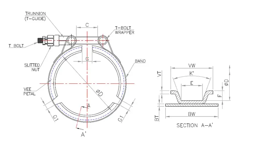 The T-bolt, trunnion, and nut mechanism, along with the self-locking nut configuration, ensures the clamp remains secure under high pressures and heavy vibrations. The high axial clamp force withstands the burst pressures typical in exhaust systems.