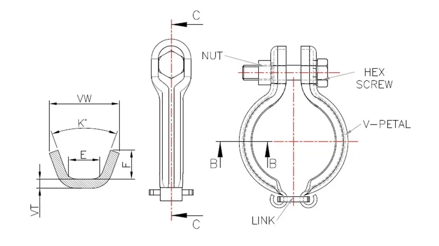 Jolly V-clamp with Connecting link is a medium duty compact V-band design for easy & quick installation of small size flanged connections. With availability of a wide range of weldless V-profiles, V-clamp is most widely used in applications like EGR tube fittings.